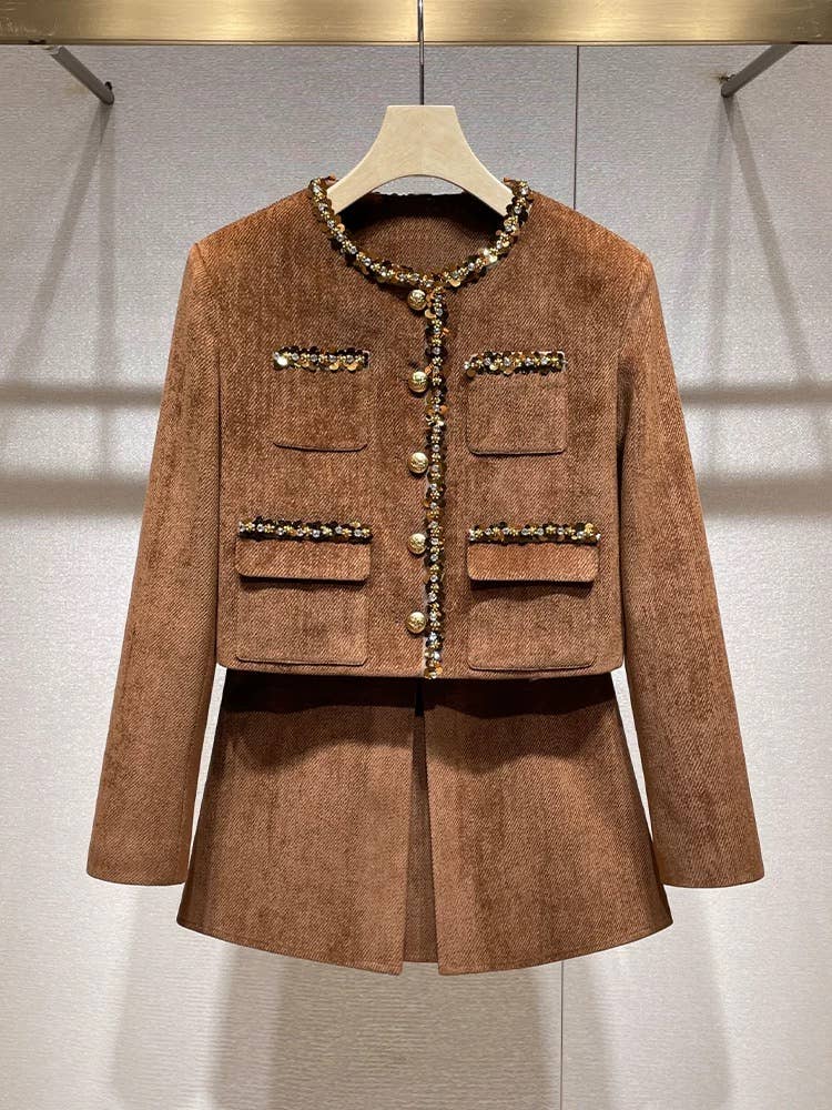 This autumn women¡¯s tweed set features a beautifully tailored jacket and matching skirt, crafted from premium textured tweed fabric. Adorned with hand-applied sequins and rhinestones, the ensemble sparkles subtly under the light, showcasing exquisite craftsmanship and refined detail. The structured jacket creates an elegant silhouette, while the mini skirt adds a touch of modern femininity. Perfect for formal occasions, events, or stylish daily wear, this set blends vintage charm with contemporary sophistication¡ªan ideal choice for women who appreciate timeless elegance with a touch of glamour.
