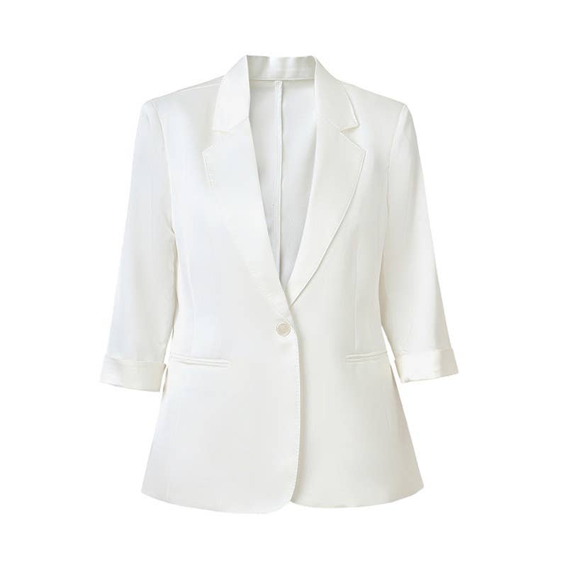Introducing our Elegant Slim Fit Suit Jacket, perfect for spring and autumn. This chic piece features three-quarter sleeves and a sophisticated one-button closure, offering a sleek and flattering silhouette. The notched lapel and flap pockets add a touch of classic style, while the high-quality fabric ensures durability and comfort. Ideal for any occasion, this jacket transitions effortlessly from professional settings to casual outings.