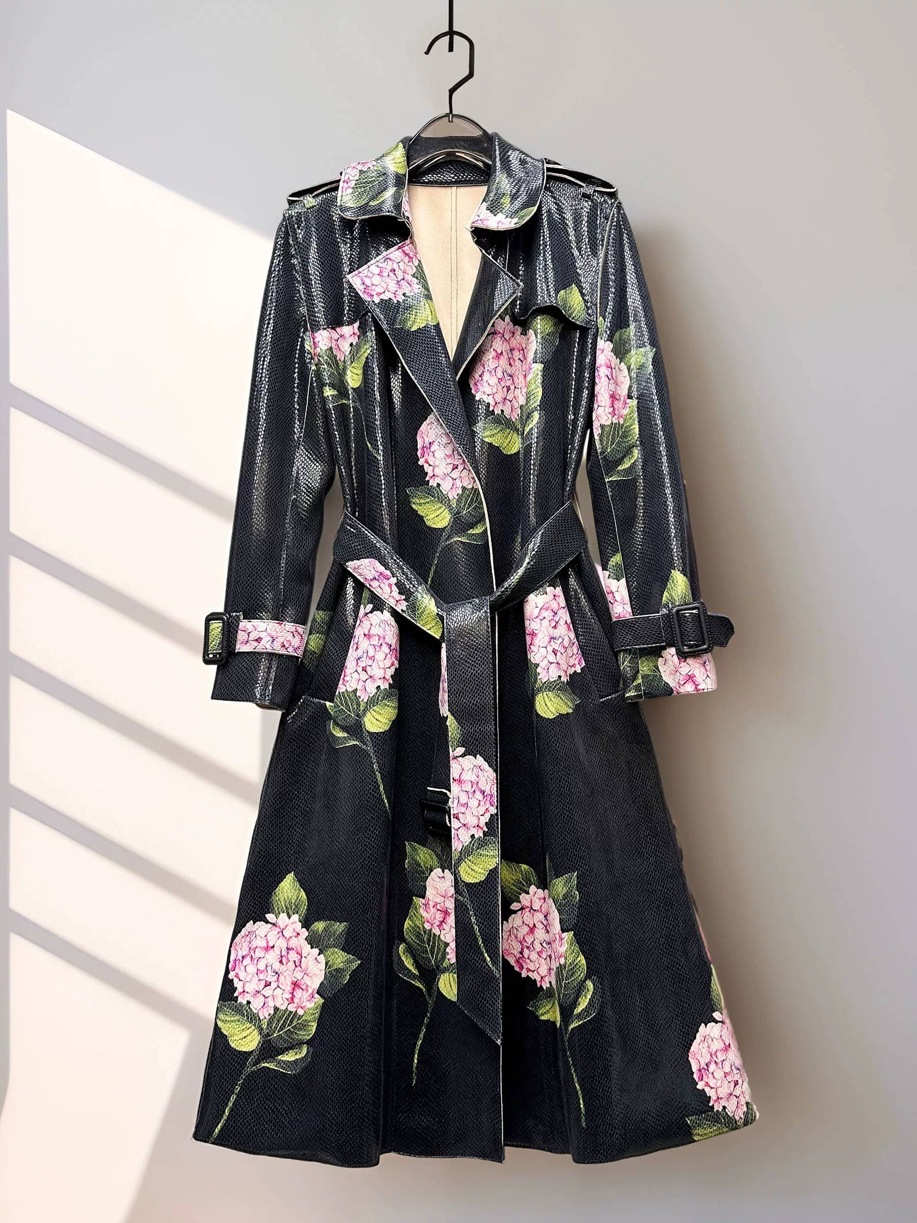 This chic PU leather trench coat features a stylish printed design that adds a modern artistic flair to your spring and autumn wardrobe. The classic blazer-style lapel and long sleeves create a sleek silhouette, while the adjustable belt accentuates the waist for a flattering, feminine shape. Crafted from soft, durable faux leather, it offers both comfort and structure for transitional weather. The mid-length cut provides versatile layering options, perfect for pairing with dresses, skirts, or trousers. Ideal for city outings, parties, or daily wear, this coat combines elegance, edge, and sophistication in one timeless piece.