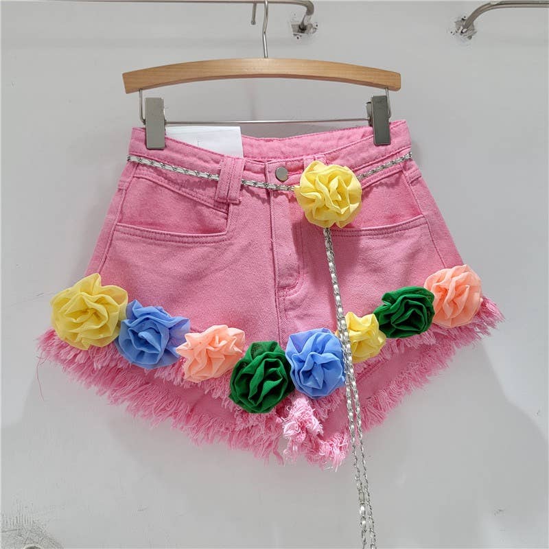 Infuse your summer wardrobe with playful charm and vibrant edge. These high-waisted A-line denim shorts flaunt raw, frayed hems and a kaleidoscope of embroidered floral appliqu¨¦s scattered across the hemline for a splash of artistic whimsy. Crafted from sturdy, mid-weight denim, they offer structure while remaining breathable for warm days. The silhouette accentuates the waist and flares gently at the thighs for a flattering, elongated leg effect. Available in radiant shades like pink, green, orange, blue, and classic black, they pair effortlessly with cropped blouses or tucked-in tanks for a festival-ready, street-chic vibe. Ideal for weekend strolls, music events, or spontaneous road trips¡ªthese shorts are where carefree meets creative.