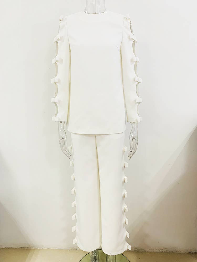 Unveil the essence of modern elegance with our Chic Bow-Top & Pants Set, tailored for the fashion-forward. This ensemble features a long-sleeved top adorned with distinctive hollow bow cut-outs, creating a statement of sophistication. The straight pants offer a sleek silhouette, ensuring a flattering fit for all figures. Crafted from luxurious fabric, this set promises comfort and style that transitions seamlessly from day to night. Perfect for wholesale, it's a versatile addition to any wardrobe, promising to captivate and charm with its unique design and impeccable quality.