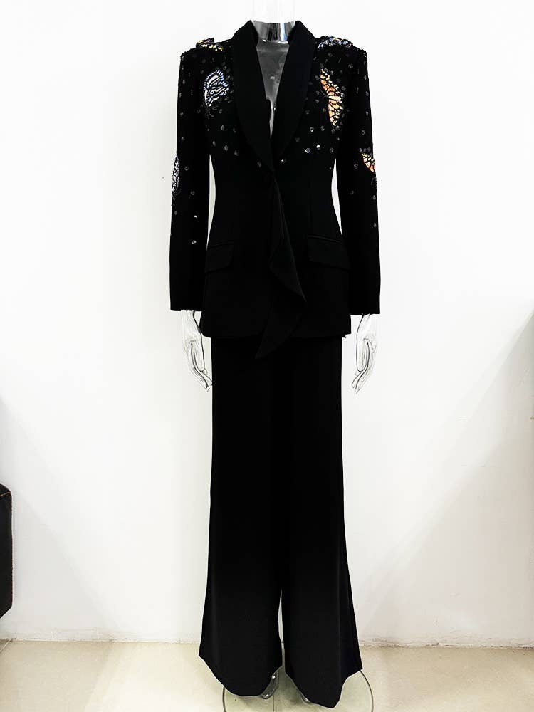 Unveil sophistication with this exquisite two-piece set, perfect for autumn and winter. The blazer, tailored to perfection, features an array of three-dimensional butterflies that seem to flutter off the fabric. Each butterfly is meticulously adorned with beads and diamonds, creating a stunning sparkle that catches the light beautifully. Paired with sleek trousers that complement the jacket¡¯s elegance, this ensemble promises to make any occasion special. Crafted from high-quality materials, it ensures comfort without compromising on style. Whether for a formal event or an upscale casual outing, this set will be your go-to choice for making an unforgettable fashion statement.