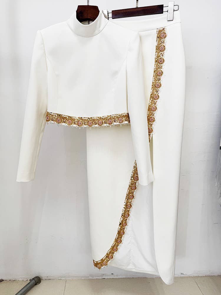 This fashionable two-piece set showcases exquisite handmade sequin embroidery and delicate beadwork, reflecting refined craftsmanship and luxury. The cropped top is beautifully adorned with shimmering details that catch the light from every angle, while the matching long skirt flows gracefully for an elegant silhouette. Perfect for evening events, parties, or special occasions, this set blends glamour with modern sophistication. Its unique handmade artistry ensures a one-of-a-kind look that highlights both elegance and individuality.