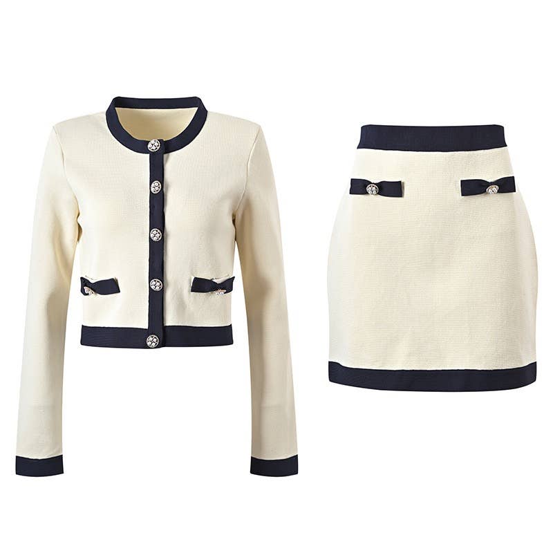 This elegant ivory knit set is a refined choice for transitional seasons, blending classic charm with modern polish. The cropped jacket features a round neckline, long sleeves, and bold black trim along the collar, cuffs, and button placket. Decorative pockets and metallic buttons add a touch of sophistication, while the subtle bow detail enhances its feminine appeal. The matching skirt echoes the contrast design with black-trimmed tabs and buttons at the waist, creating a cohesive and tailored silhouette. Ideal for formal events, afternoon gatherings, or stylish office wear, this ensemble exudes grace and versatility.Women¡¯s sweater.