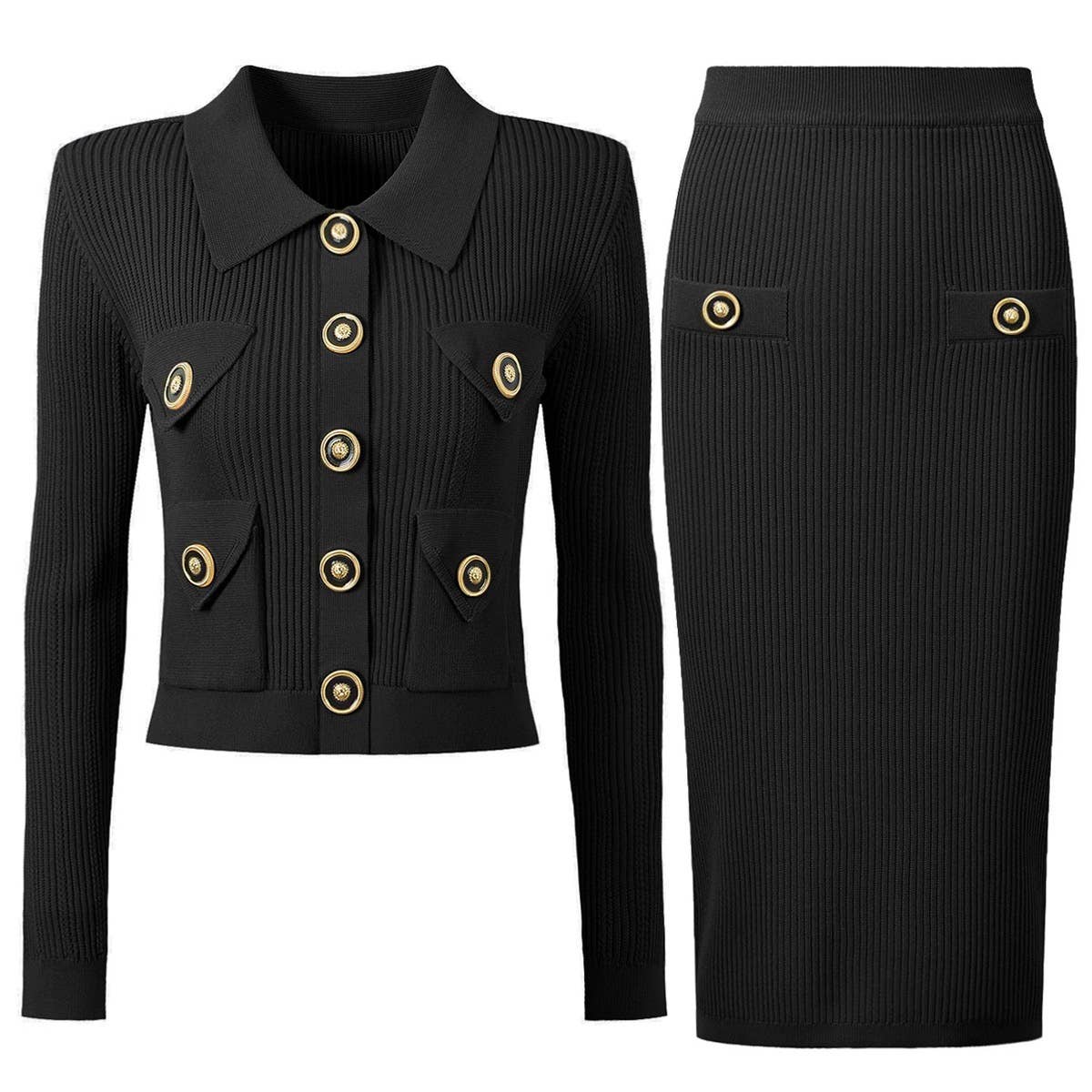 This stylish two-piece knit set in a soft blush pink is perfect for transitional seasons. The long-sleeve cardigan features a wide collar, ribbed texture, and six round buttons down the front, complemented by four decorative flap pockets for added charm. The matching pencil skirt hugs the silhouette with a flattering fit and includes two buttoned flap pockets at the waist, echoing the top¡¯s design for a cohesive look. Ideal for work, brunch, or casual outings, this ensemble blends comfort with sophistication. Pair with ankle boots or heels for a polished finish.