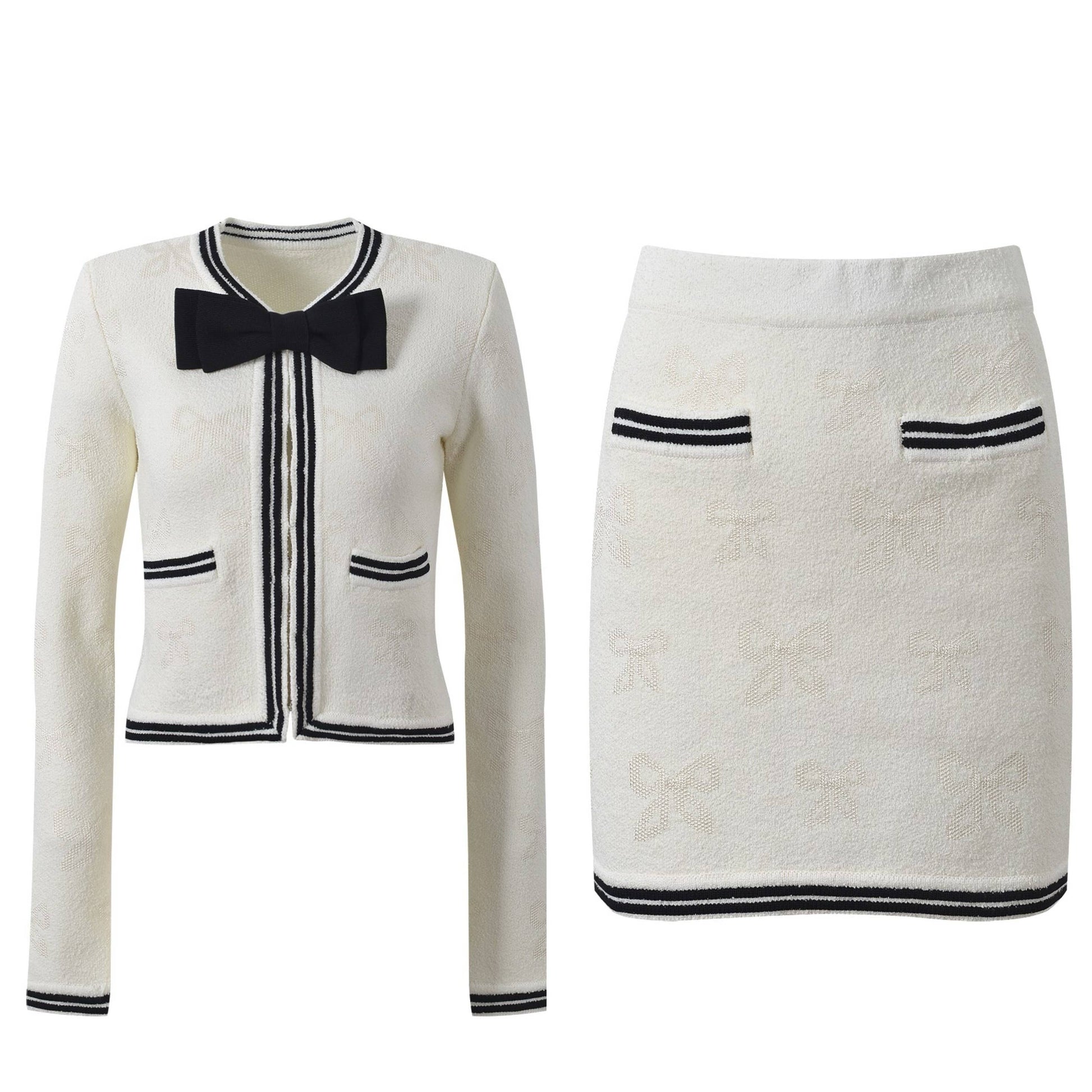This chic two-piece outfit combines a soft wool jacquard knit cardigan with delicate bow detail and a flattering A-line mini skirt. The cardigan features a refined textured pattern, long sleeves, and a graceful feminine silhouette, while the matching skirt highlights the waistline with its structured yet comfortable fit. Perfect for spring and autumn, this versatile set blends elegance and coziness, making it suitable for daily wear, gatherings, or stylish office looks. The coordinated design ensures effortless dressing with timeless charm.