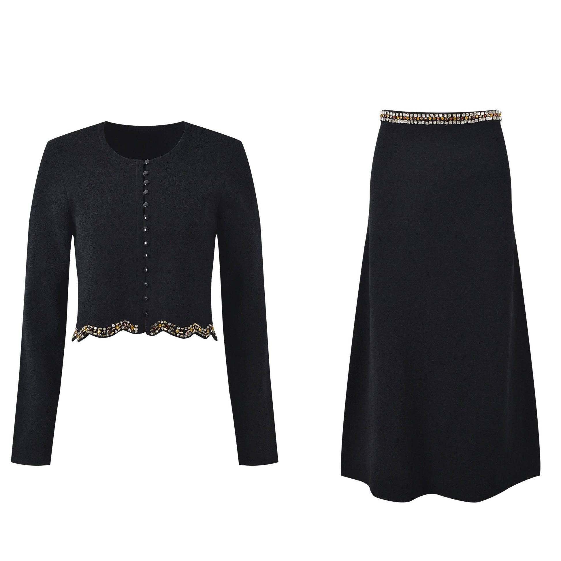 Refined elegance meets artisanal charm in this black knit two-piece set, perfect for autumn and winter occasions. The long-sleeved top features a scalloped hemline adorned with hand-applied gem embellishments in gold and silver tones, adding a touch of opulence to its minimalist silhouette. Paired with a matching A-line skirt, detailed with coordinating trim at the waistband, the ensemble offers a harmonious balance of texture and sparkle. Ideal for formal gatherings or elevated daywear, this set pairs beautifully with heeled boots or metallic accessories for a polished, confident look.
