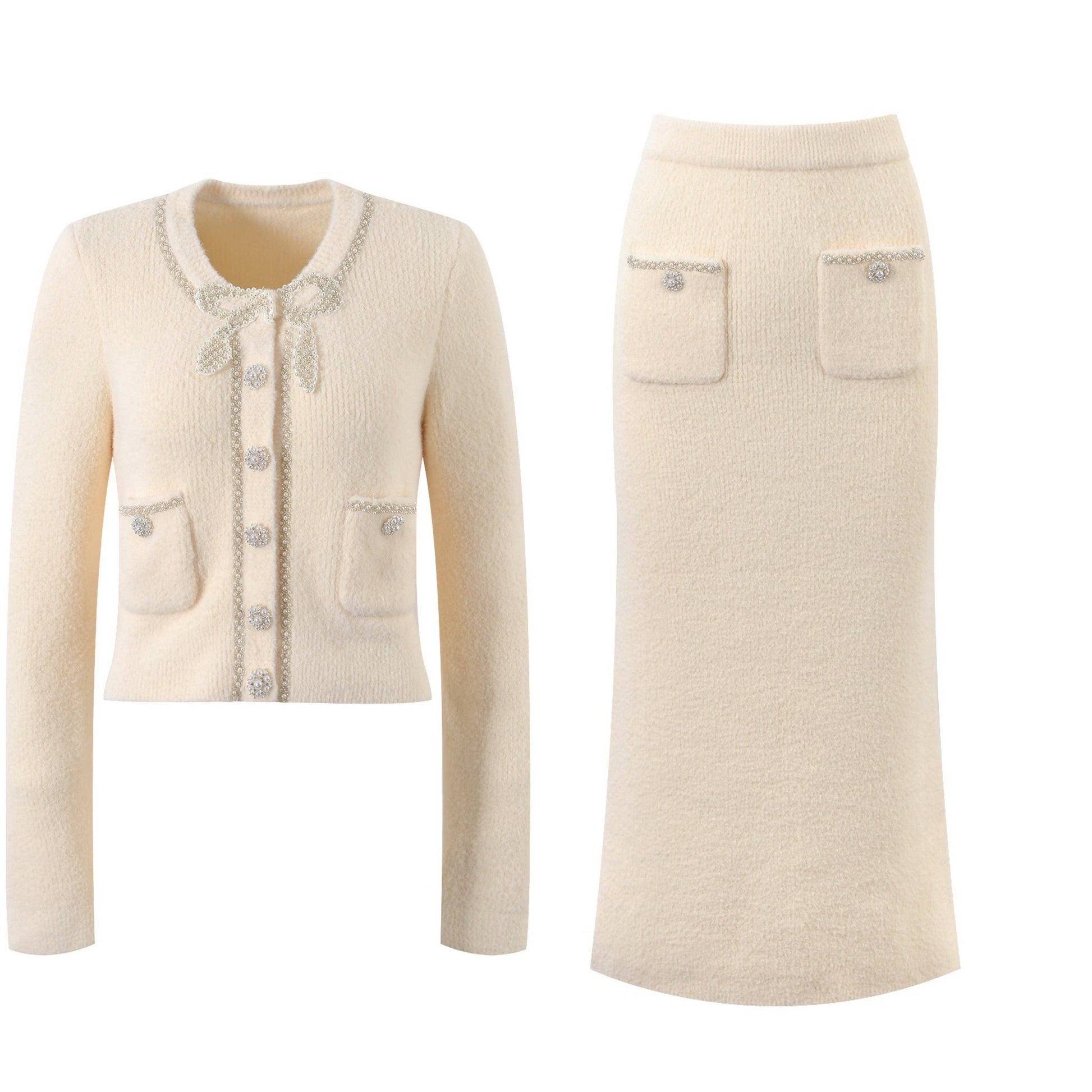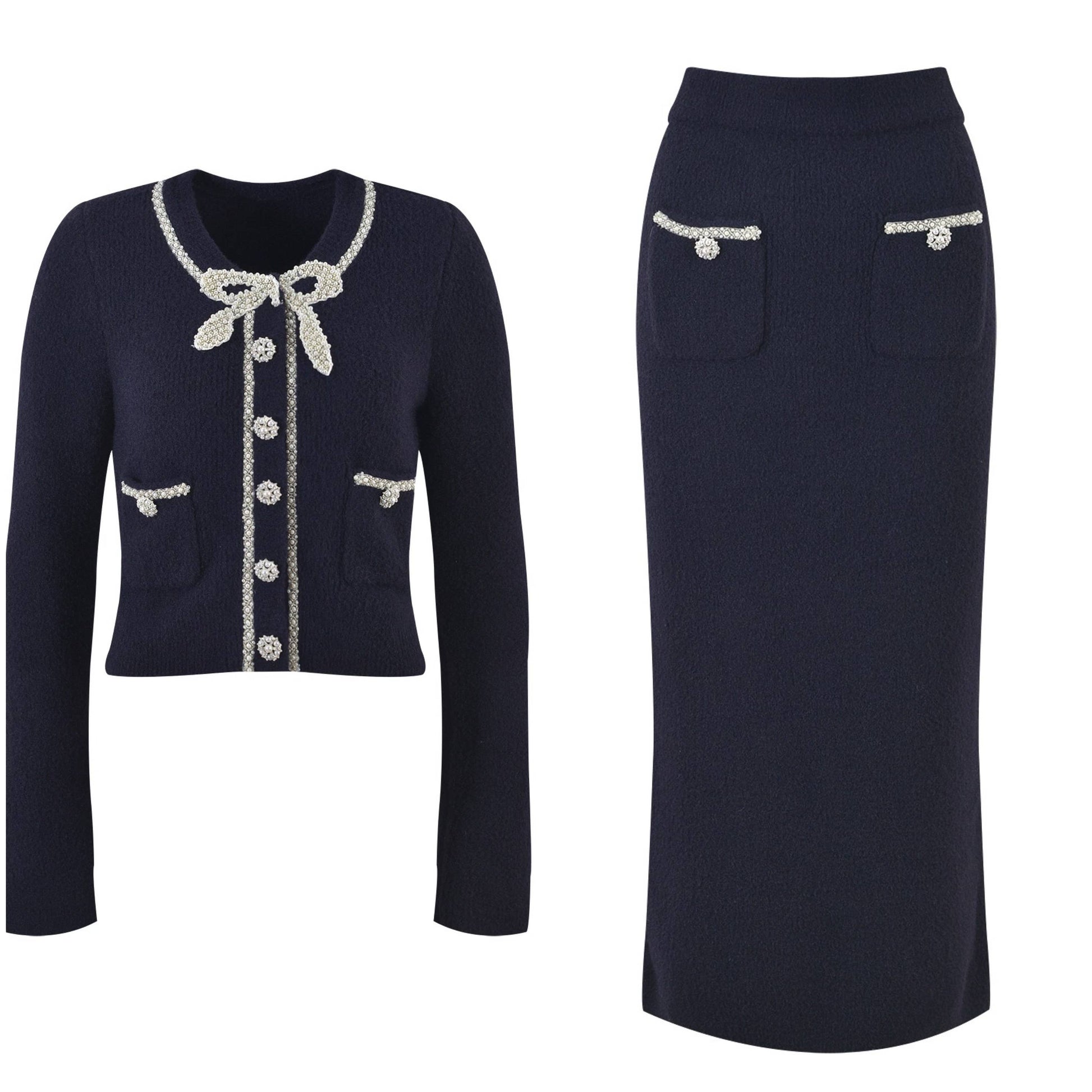 This 2025 autumn women¡¯s outfit set combines a tweed-inspired knit cardigan with a matching long skirt, creating a perfect balance of elegance and softness. The cardigan is adorned with delicate pearl and rhinestone bow embellishments, adding a feminine and graceful touch. Crafted from high-quality knitted fabric with a soft, textured surface, it provides comfort and sophistication for cooler weather. The long skirt features a flattering silhouette that elongates the figure, ideal for daily wear, gatherings, or special occasions. A refined and romantic ensemble for the modern woman.