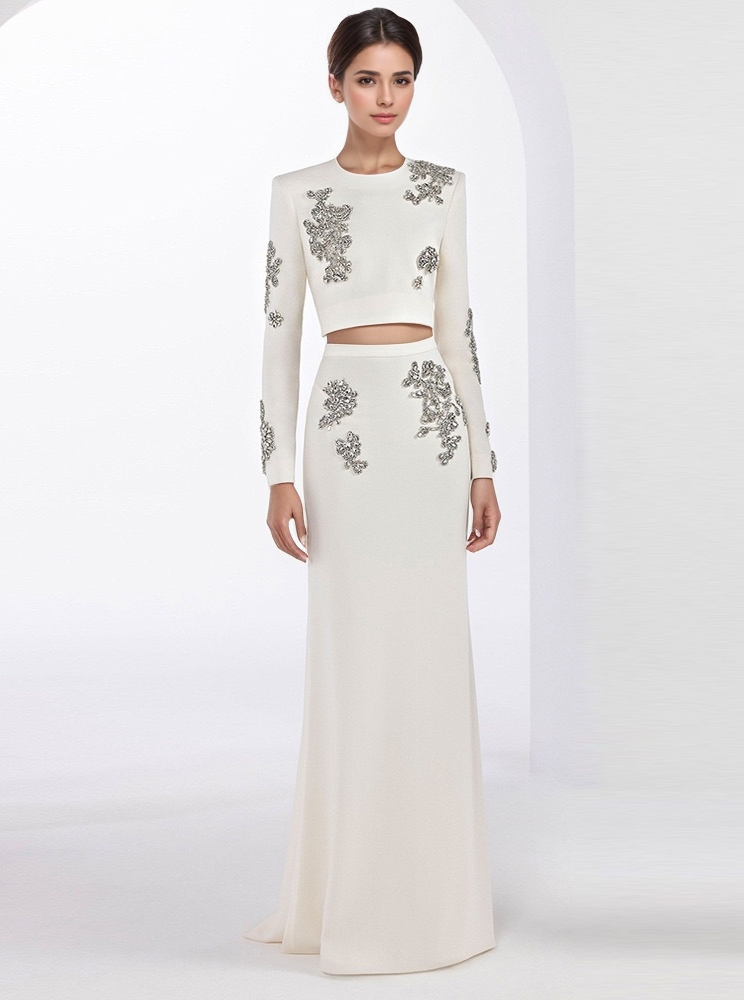 Make a statement of elegance with this breathtaking two-piece suit. The set includes a short, intricately crafted top adorned with handmade beaded diamond accents that sparkle with sophistication. Long sleeves complement the design, while the detailed beading adds luxury to the shoulders and chest. Paired with a graceful long skirt featuring cohesive diamond-beading patterns, the outfit exudes harmony and style. Perfect for special occasions, this ensemble combines modern flair with timeless craftsmanship. Elevate your wardrobe with this masterpiece that radiates charm and attention to detail!