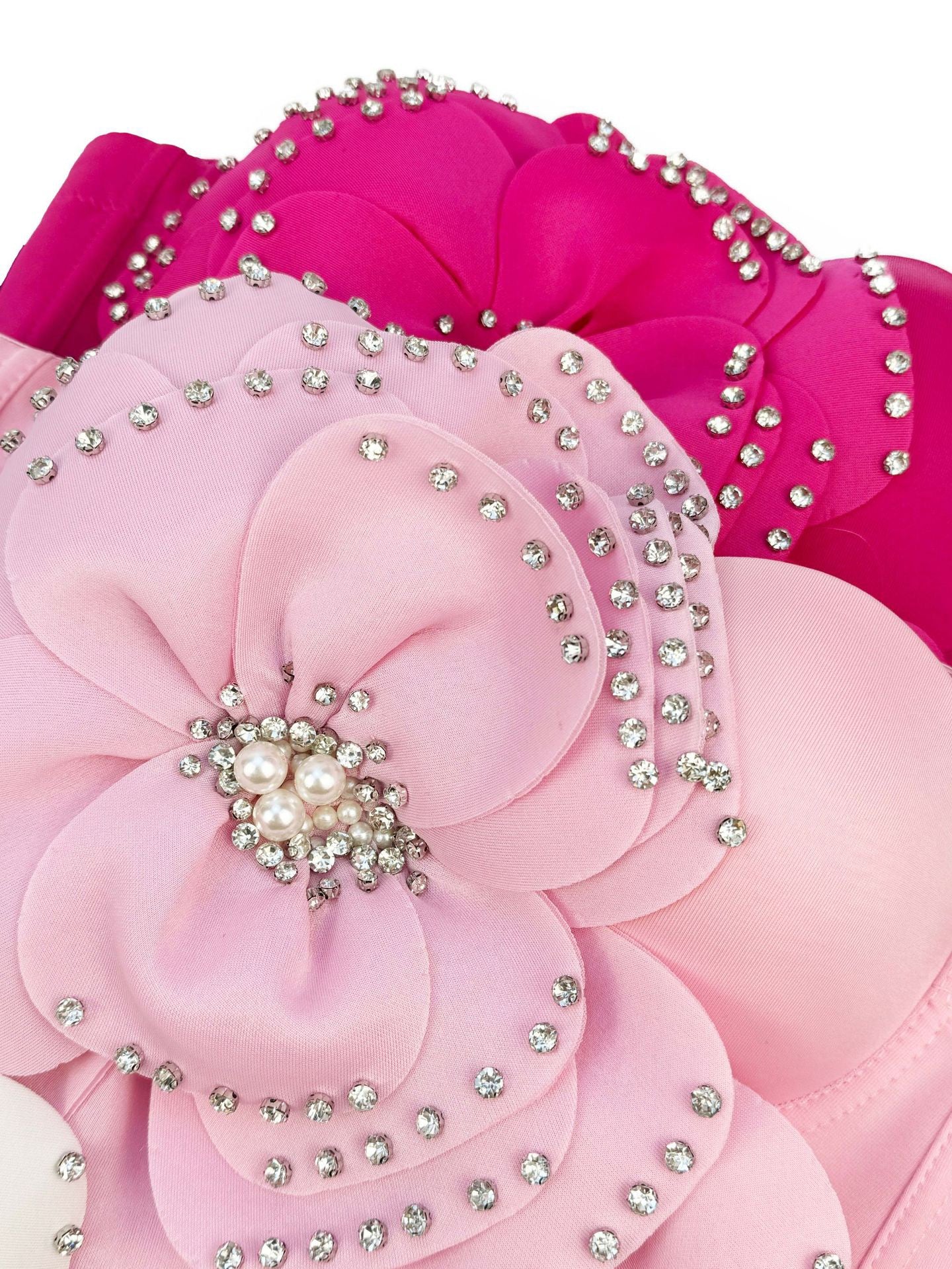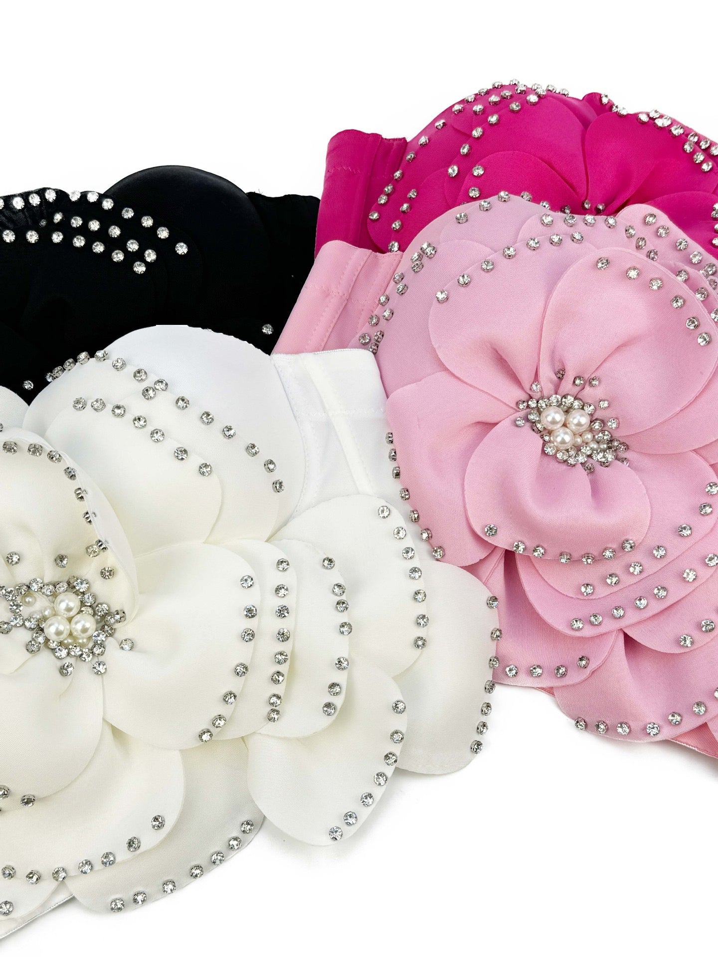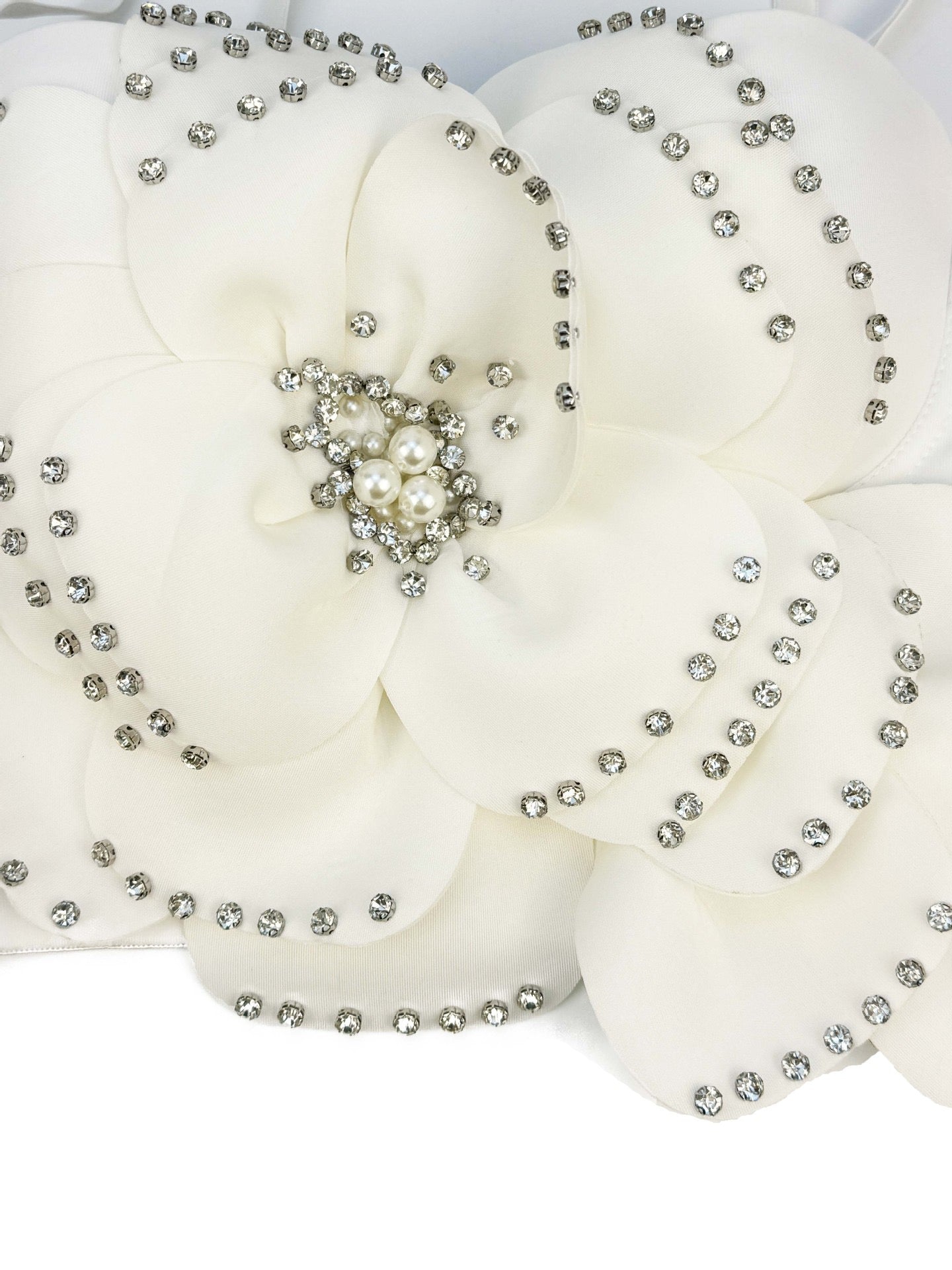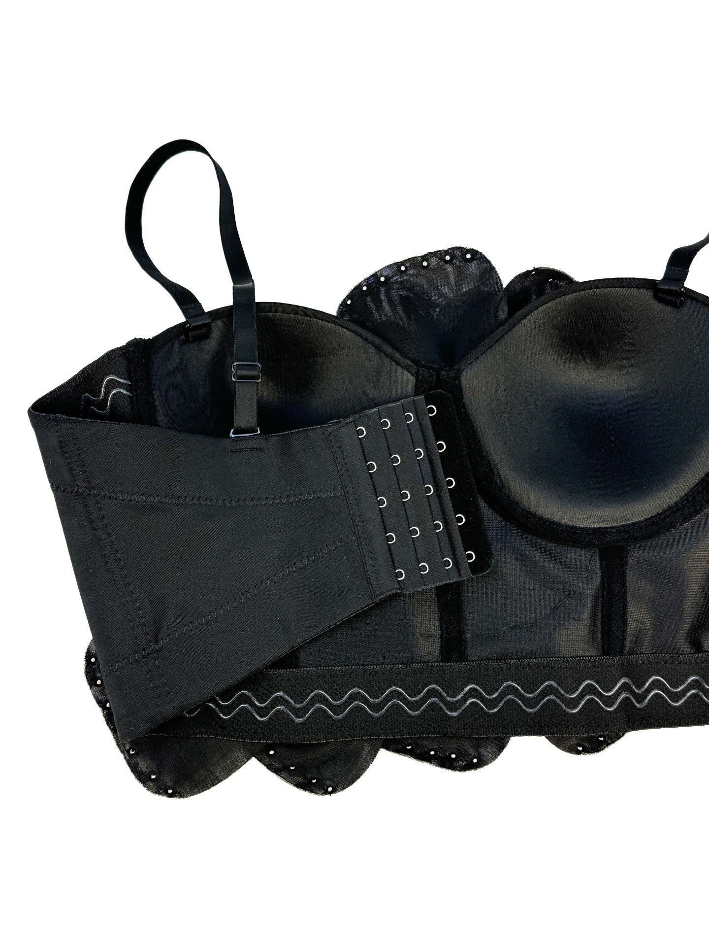 This sophisticated outerwear piece features a striking large flower embellishment and intricate multi-layer beading, creating a luxurious and high-end aesthetic. The herringbone structure provides a flattering shape and secure fit, ensuring both style and support. Designed with delicate suspenders, it effortlessly balances elegance with a touch of sensuality. Crafted from premium materials, this statement bra offers versatility as both inner and outer wear, perfect for layering in bold fashion ensembles. Ideal for upscale events or styling with modern sophistication, it captures a refined yet daring essence.