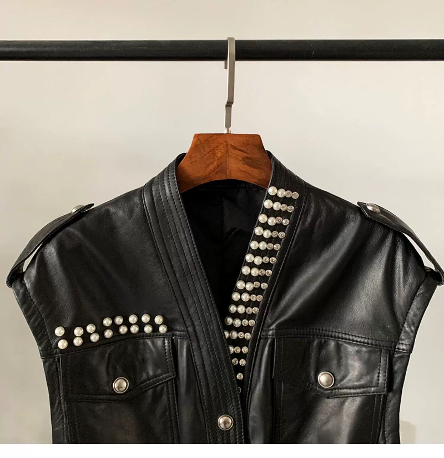 This sleeveless lambskin vest blends edgy elegance with refined detailing. Featuring pearl-like studs along the neckline and chest pocket flap, it adds a touch of glamour to its structured silhouette. The cinched waist enhances the figure, while metallic snap buttons and epaulets introduce a bold, utilitarian edge. Crafted for versatility, this piece transitions effortlessly from day to night¡ªlayer it over a crisp shirt or wear solo for a statement look. A standout addition to any autumn wardrobe.